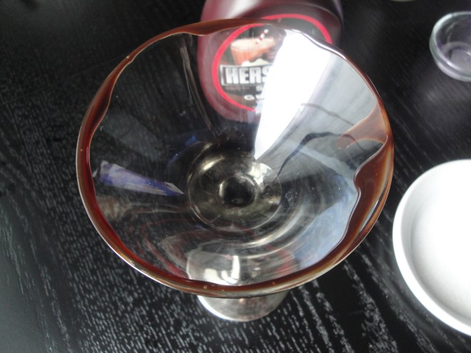Dip the rim of martini glass in chocolate syrup and coat with sea salt. Drizzle the chocolate syrup inside the martini glass.
