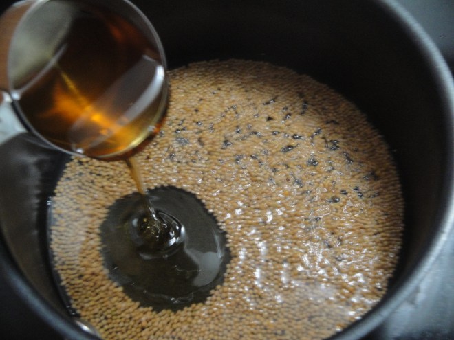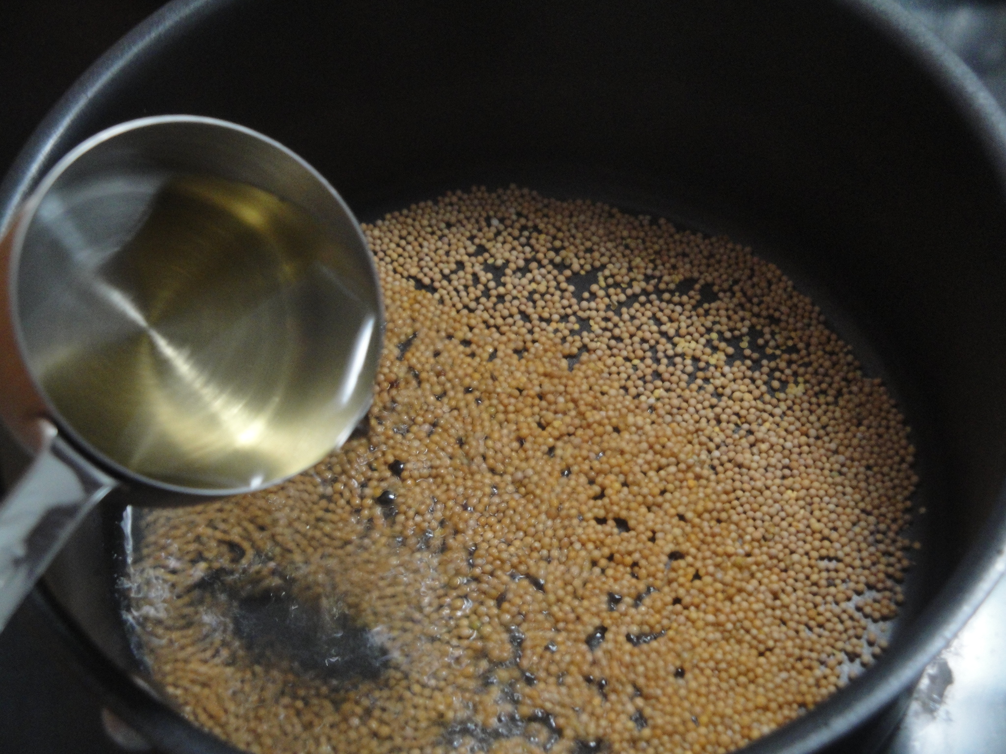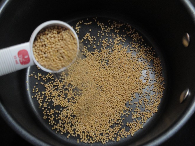 Dry the saucepan and return it to the stove. Toast the mustard seeds over low heat just until they pop, about 1 minute, stirring to prevent scorching.