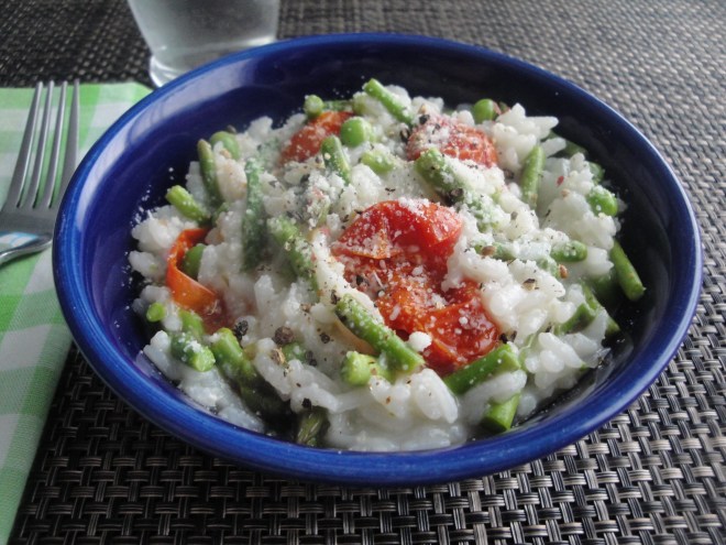 Stir in wine, and cook until liquid is nearly absorbed. (Ahh, fragrant!) Stir in 1 cup of broth mixture and cook until liquid is absorbed, stirring constantly. Continue adding remaining broth mixture, 1/2 cup at a time, until each portion of broth mixture is completely absorbed. Stir constantly.