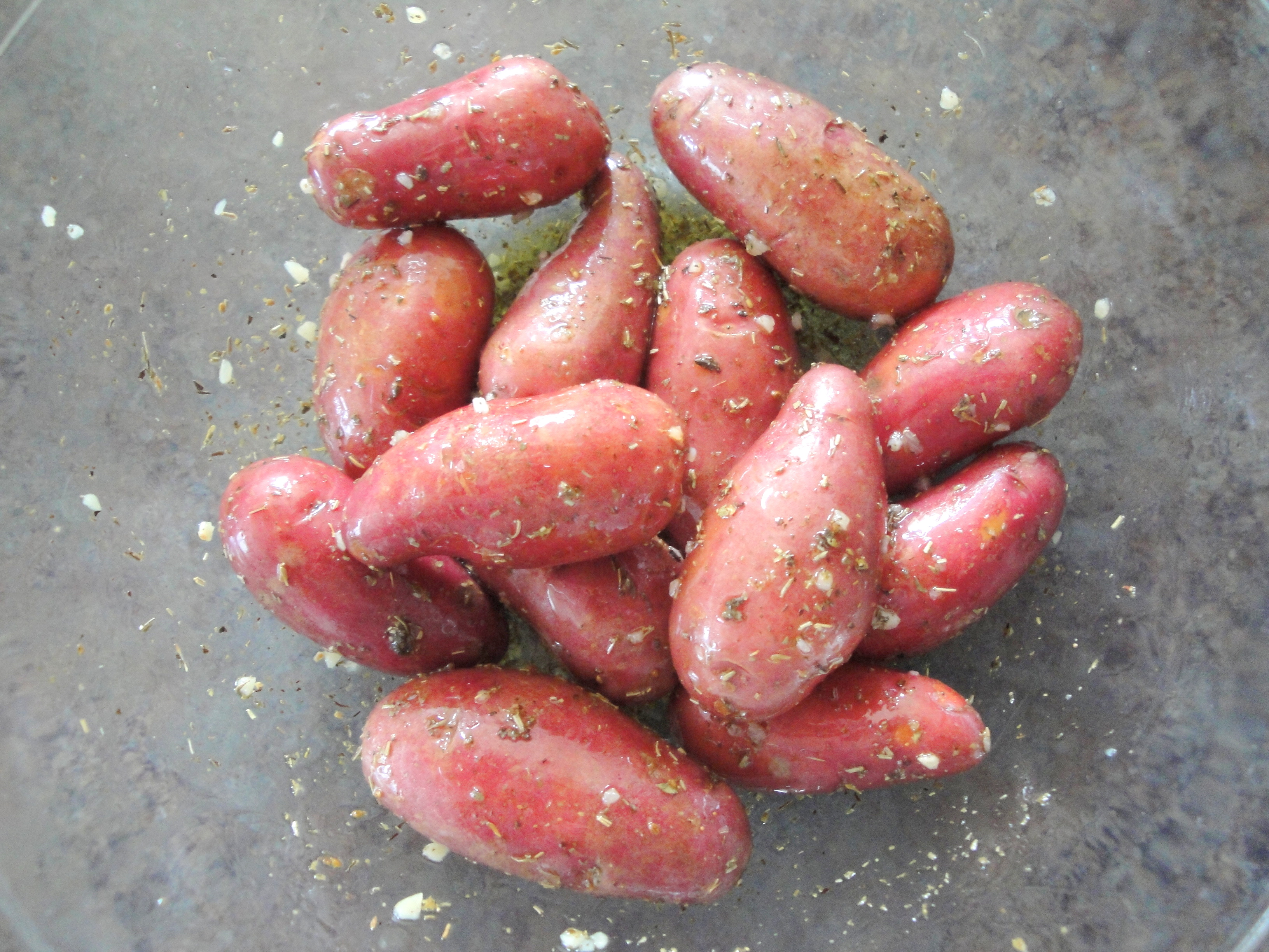 Baby potatoes are tossed with garlic, olive oil, and herbes de Provence and roasted until soft and tender.  This is a recipe from Giada De Laurentiis who is the person who first introduced me to herbes de Provence many years ago.  Since that day, I always have the herbs on hand and toss it with my chicken, veggies and almost always with my eggs.  They are simple, fragrant and mildly floral which really works with these rustic potatoes, which are slightly chewy on the outside but perfectly creamy on the inside.  I literally used a fraction of the amount of olive oil than what was called for here, just enough to lightly coat the potatoes, and they were still plenty flavorful so use your judgment.  These garlicky potatoes were an amazing side dish and unbelievably simple.