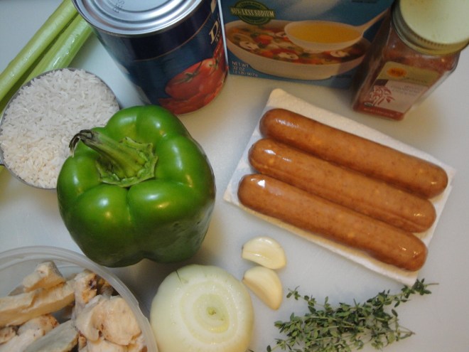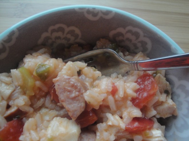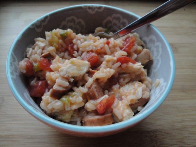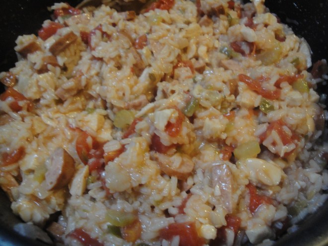 This past weekend, we got our first snow of the season in the Philadelphia area. Yes, you read that right…snow! There is something strange about looking out the window and seeing snow in the foreground and vibrant orange and yellow leaves still on the trees in the background. The sound of the chilly wind and sharp ice particles hitting my window prompted me to reach for a one pot dish like Chicken and Sausage Jambalaya. I made this recipe early on Saturday morning while it was still slightly dark out and my house smelled like warm comfort food all morning long. Smoked sausage is cooked with onion, green pepper, and celery before being simmered with long-grain rice, chicken broth and thyme. Once the rice is cooked and the liquid is absorbed, diced tomatoes, cayenne pepper, and cooked chicken are added. I used smoked turkey sausage with pepper jack cheese in this dish which added another level of heat with the cayenne pepper and was very tasty. I also used precooked chicken which has become one of my favorite time savers. I grabbed a warm bowl of this and ate it while I cozied up on the couch with a blanket and watched the unseasonal slushy snow fall. Hopefully you’ll try this too, only without the snow!