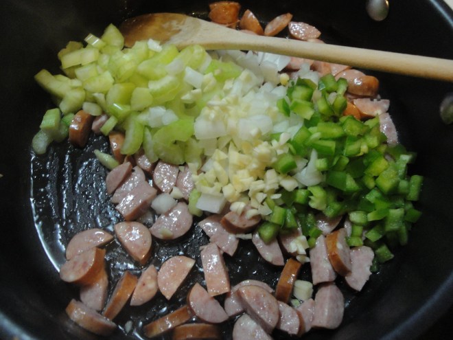 Add in celery, onion, green pepper, and garlic.
