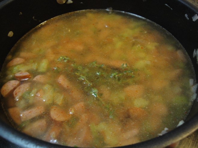 Once vegetables are tender, add in rice, water, broth, cayenne, salt, and thyme sprigs. Bring to a boil and let simmer for 20 minutes until rice is cooked.
