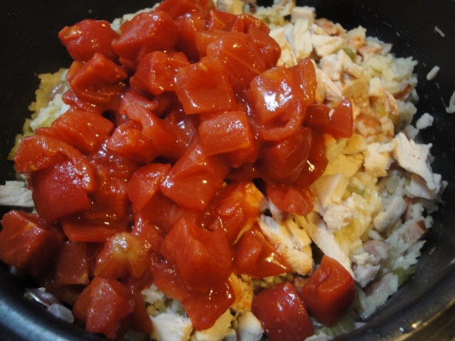 When rice is cooked and all the liquid is absorbed, remove the thyme springs and stir in cooked chicken and undrained diced tomatoes. Cook a few minutes more until chicken and tomatoes are warm.